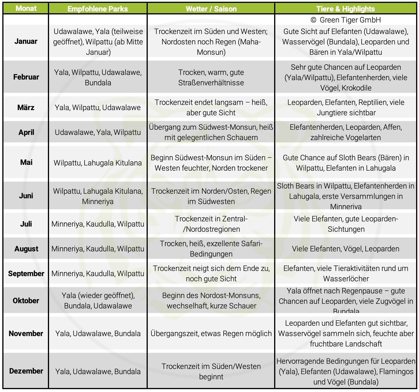 Wenn Sie wissen, welche Tiere Sie auf Ihrer Sri Lanka Safari entdecken möchten, bietet folgende Übersicht eine Orientierung: